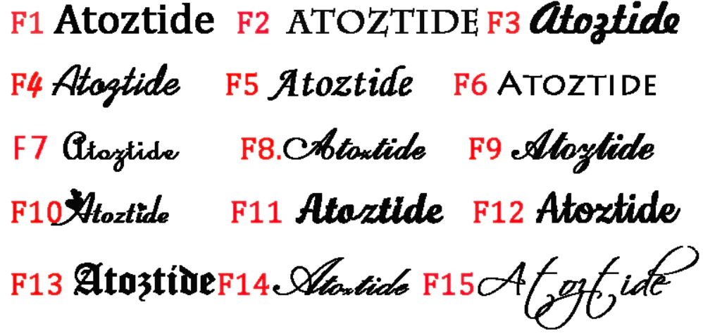 Note: Give the name to be printed and the font number (1 to 15) in the order notes (when placing the order after checkout).